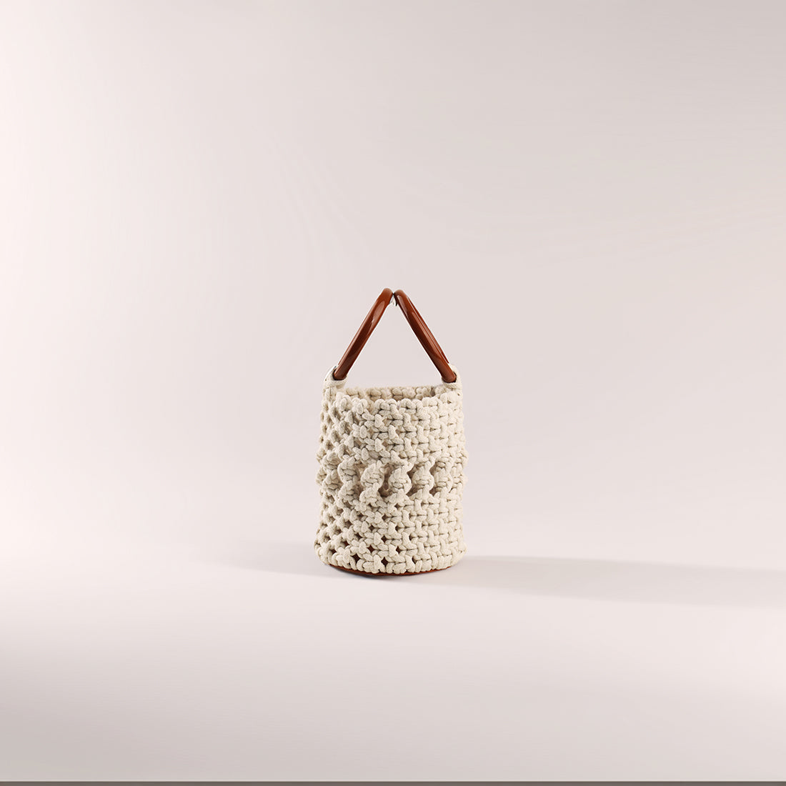 A handcrafted cylindrical macramé bag with a unique design, featuring a circular wooden handle for a blend of elegance and simplicity.